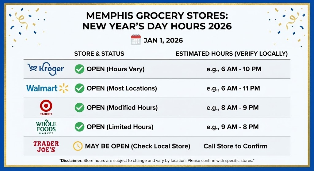Here’s a detailed look at grocery stores in Memphis and surrounding suburbs expected to be open on Wednesday, Jan. 1, 2026. Note that hours may vary by location, and shoppers are advised to check with individual stores before visiting:
